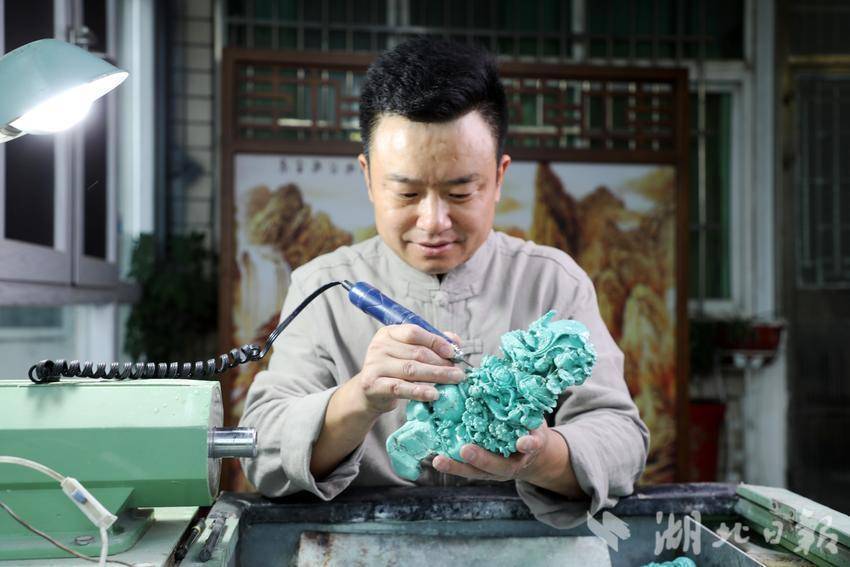 在国际绿松石工业园的雕刻车间,秦黎鹏正指导学徒雕刻藏传佛像。“每尊需7次抛光,花费两天时间,价值3000元。”这位“天工奖”得主来自“中国玉雕之乡”河南镇平,像他这样跨省而来的工艺师,竹山县已汇聚5000余人。